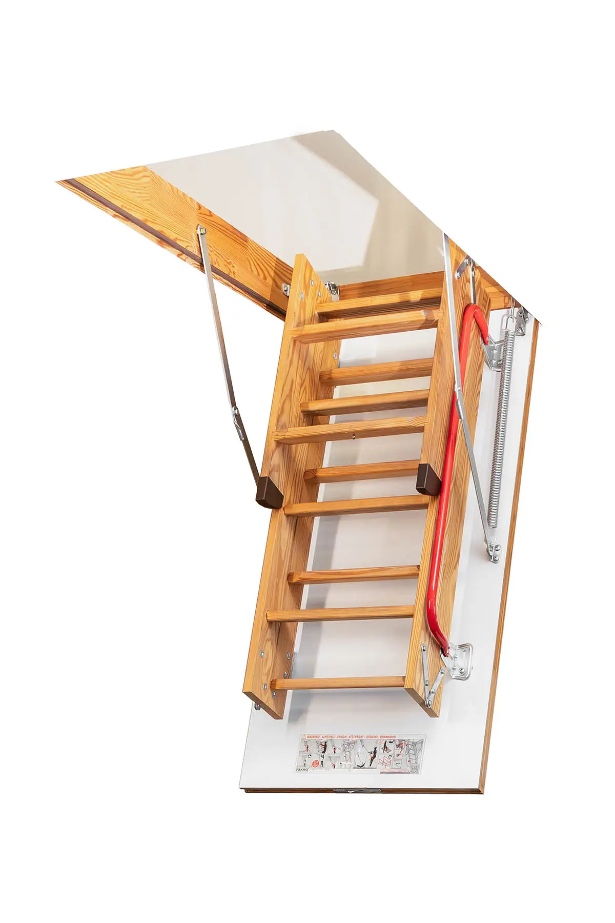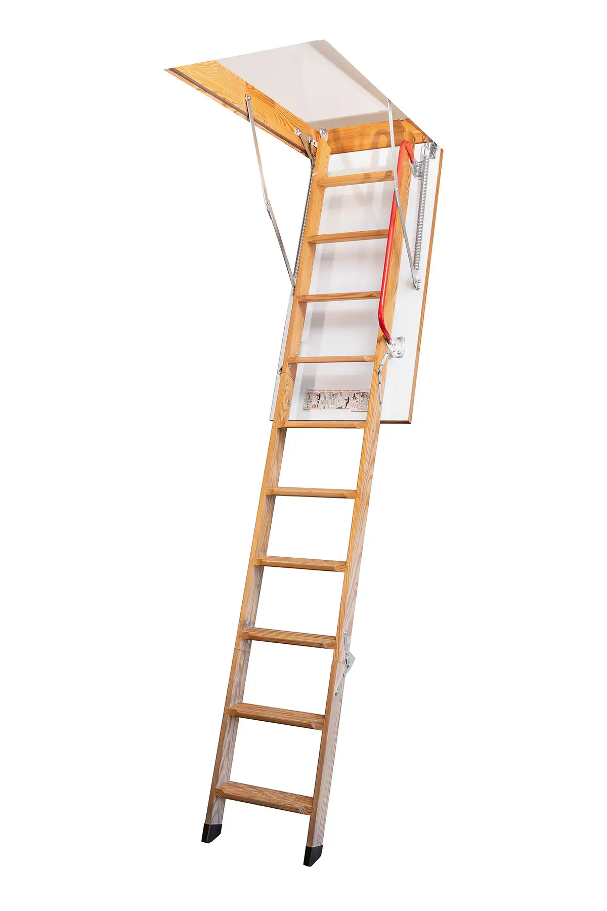 O tampo da escada é uma escotilha isolada dupla-face branca tipo sanduíche, com 3,6 cm de espessura, proporcionando excelente isolamento termoacústico e reduzindo significativamente a perda de calor do ambiente. A caixa é fabricada em pinho europeu de reflorestamento, seco em estufa, equipada com vedação periférica em borracha, garantindo estanqueidade perfeita e proteção contra pó, insetos, etc.
